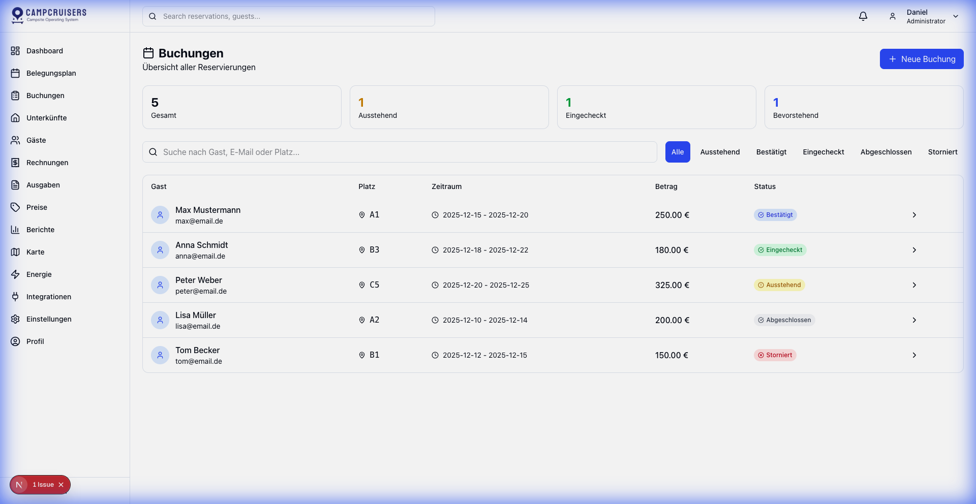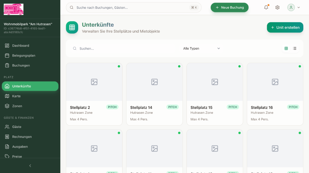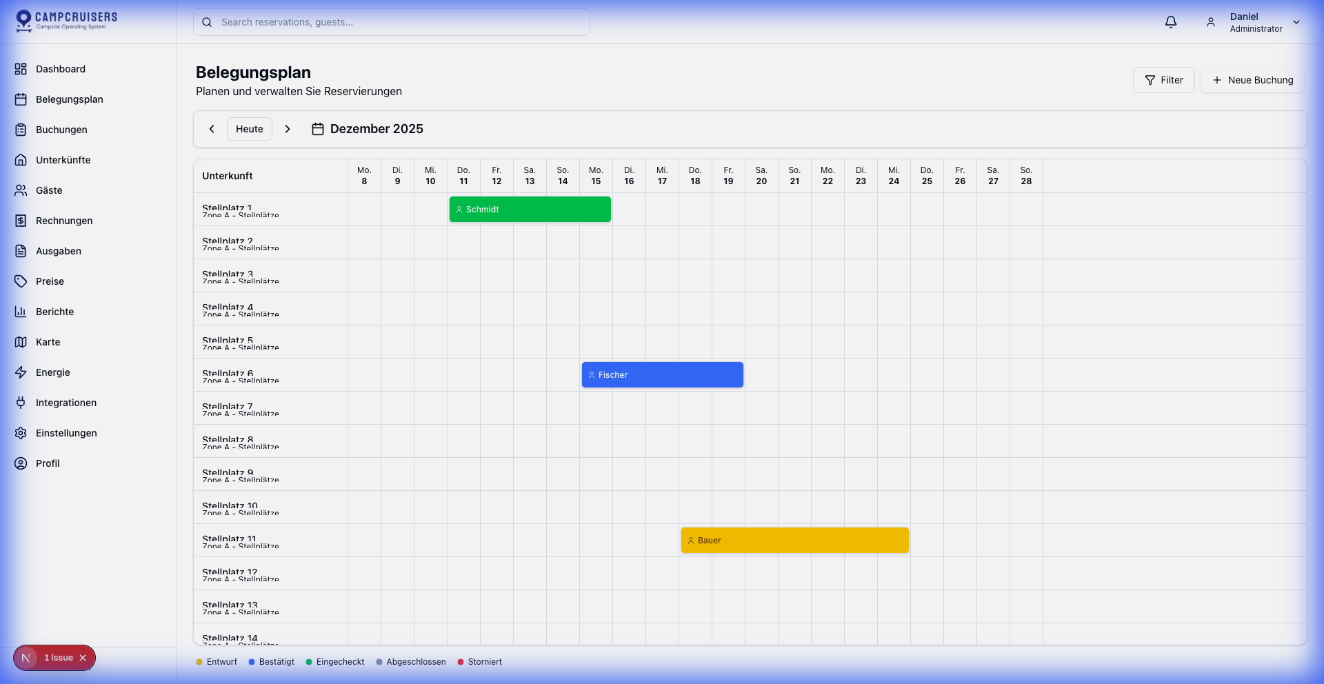 Übersichtlicher Kalender mit Drag & Drop für alle Stellplätze